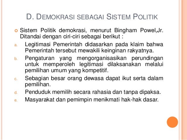 Ciri ciri sistem politik demokrasi. Nya adalah segala bentuk keputusan yang dicanangkan oleh pemerintah berdasarkan kepentingan rakyat dan keinginan rakyat. Pembagian sistem politik menurut samuel hutington yaitu sistem politik demokrasi dan sistem politik nondemokrasi.